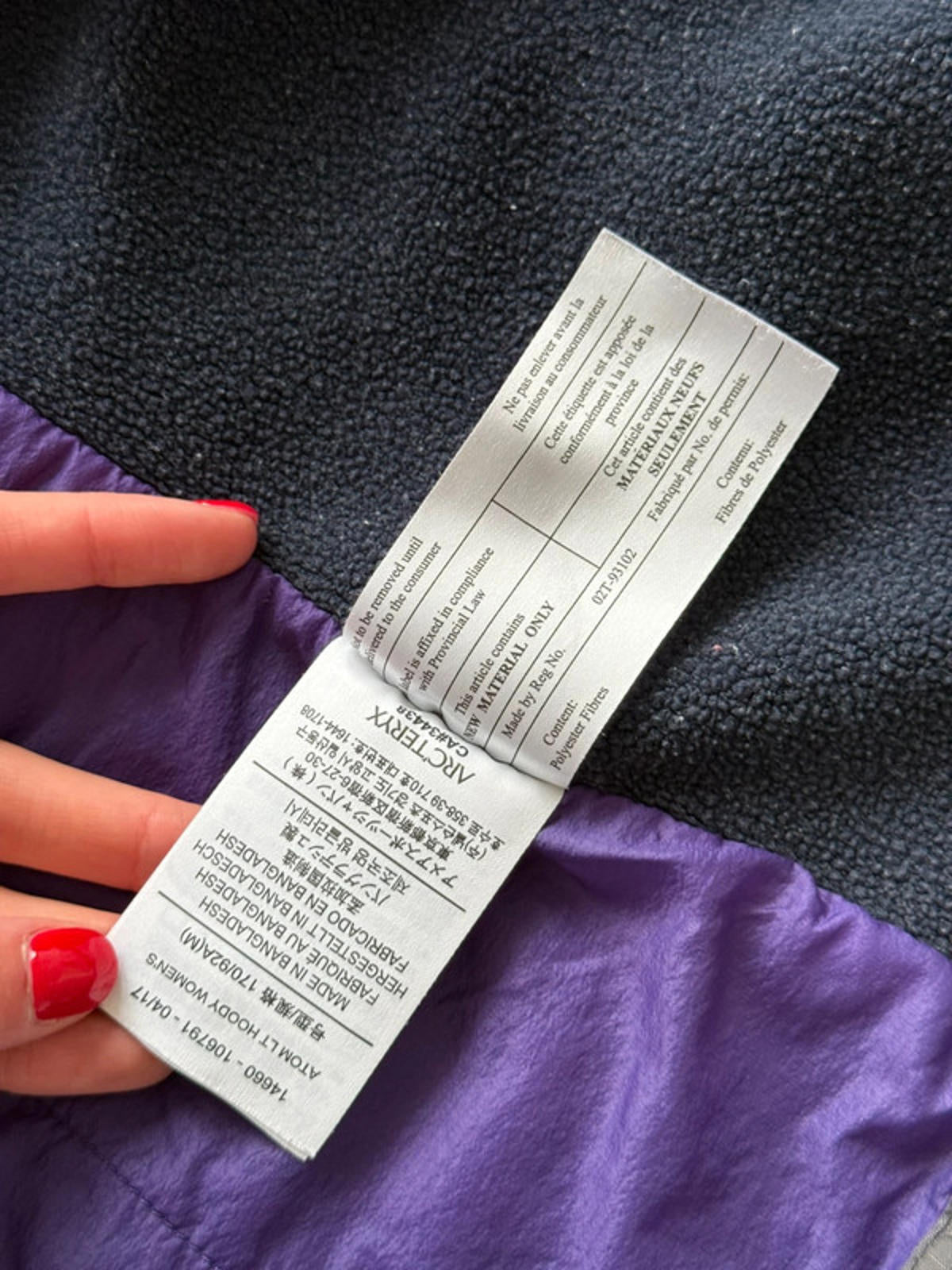 Arc’teryx Atom LT Hoody in navy with full zip, insulated core and breathable fleece side panels (Coreloft insulation + Torrent fleece). Lightweight, warm and super versatile with an adjustable hood and soft inner lining in purple. A proper technical piece designed for everyday wear as well as outdoor use.