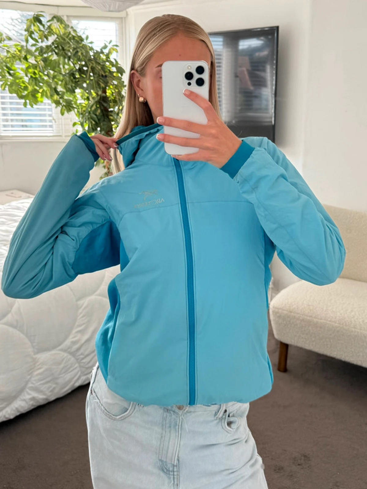 arc’teryx jacket womens, lightweight technical outerwear, blue arc’teryx hoodie, hiking jacket, outdoor performance wear, sporty zip up, premium activewear, stylish everyday coat, windbreaker style jacket