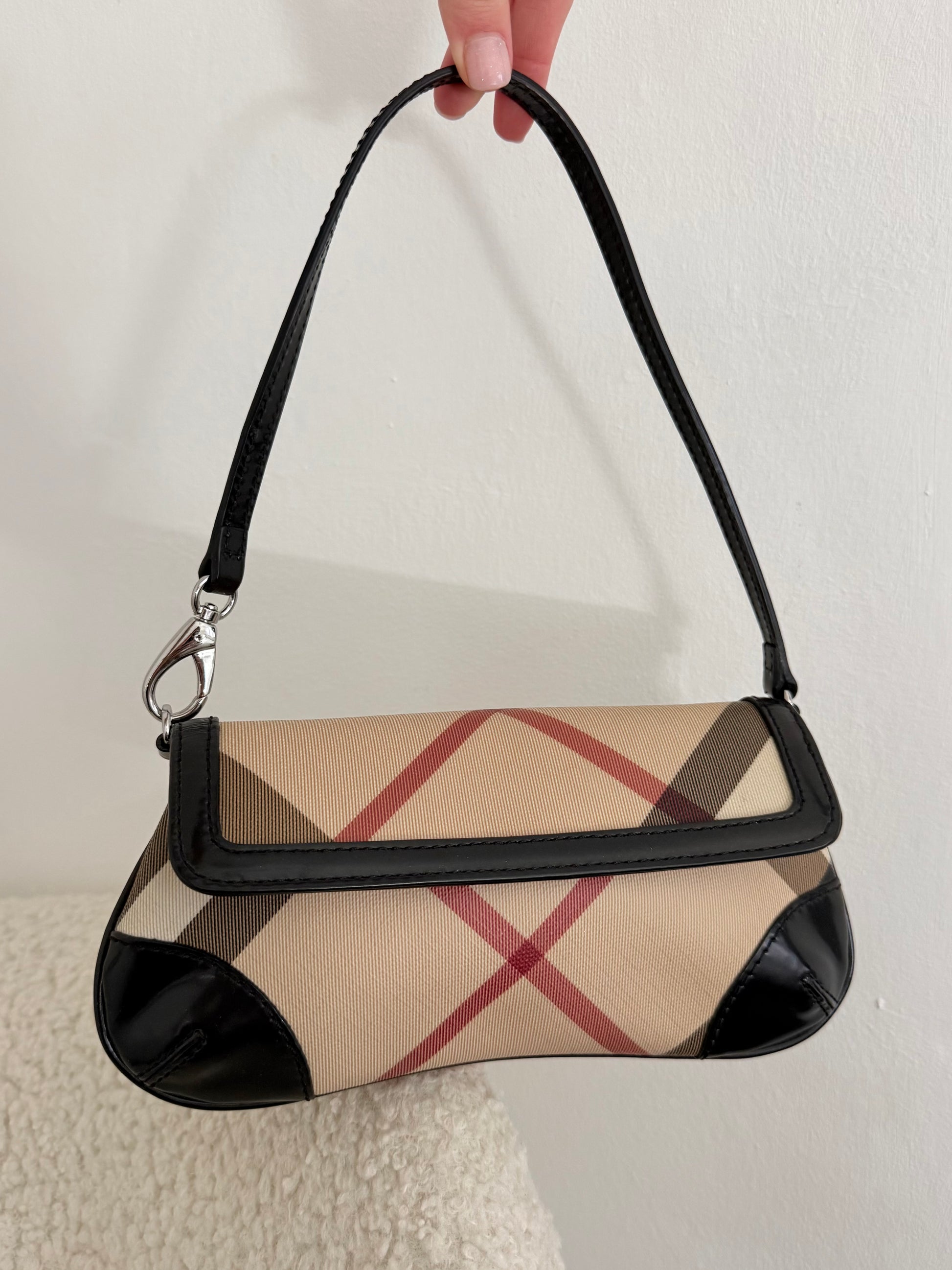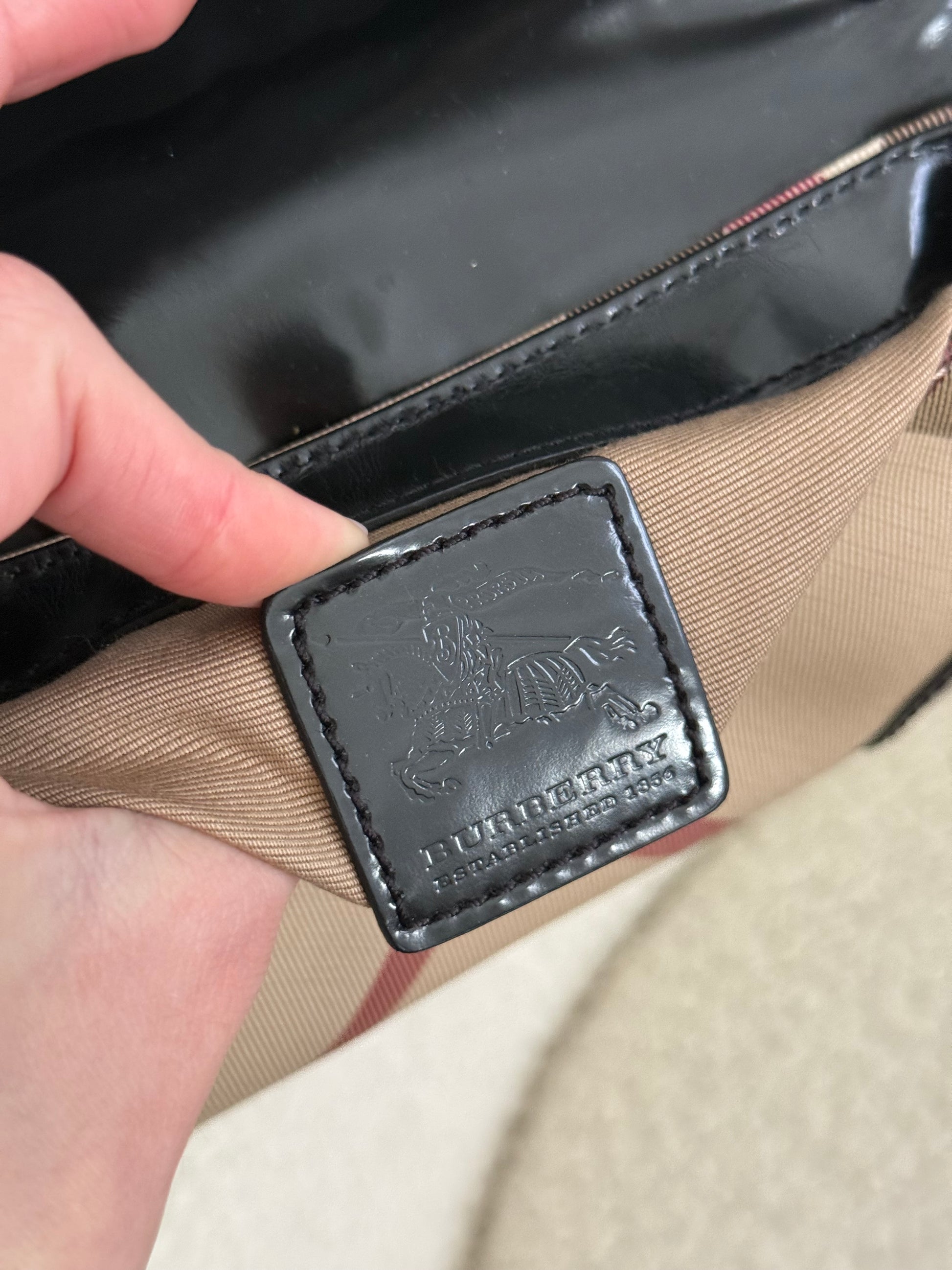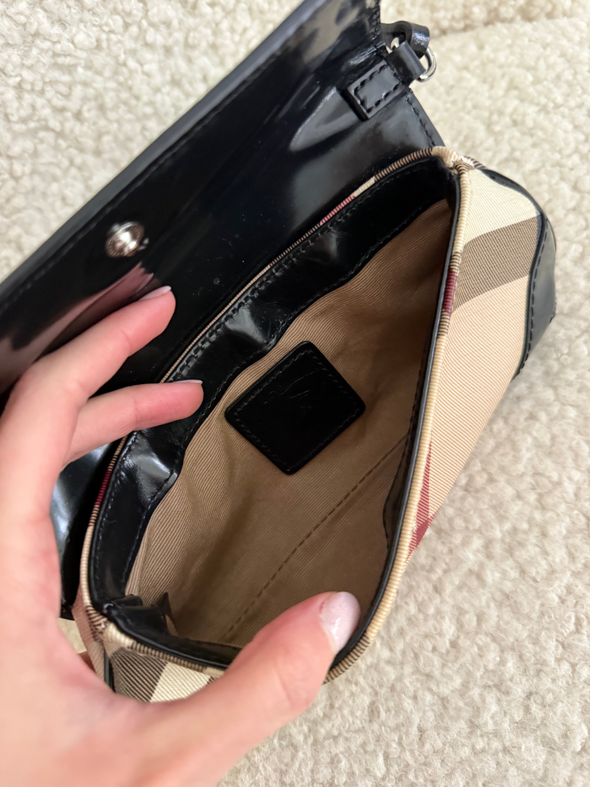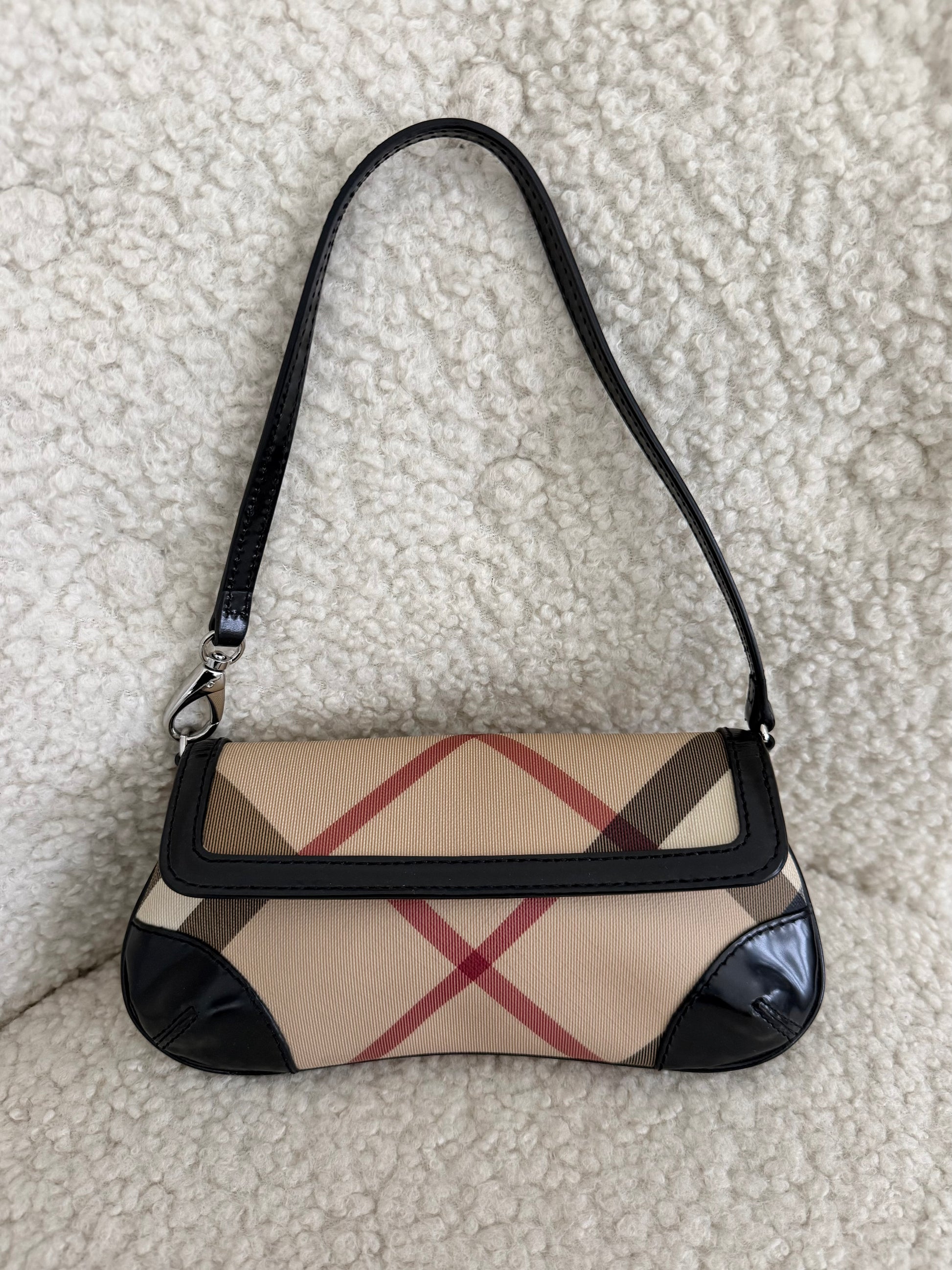 The interior is lined in black fabric and includes a Burberry London leather logo patch. A classic archive-style piece that reflects Burberry’s early 2000s aesthetic and understated branding.