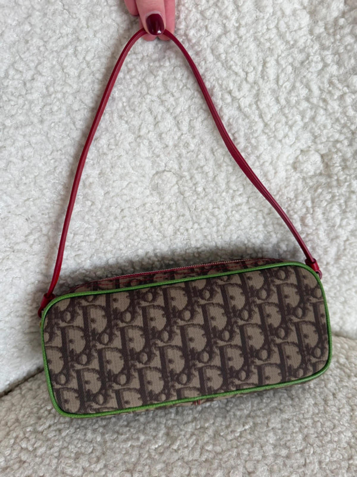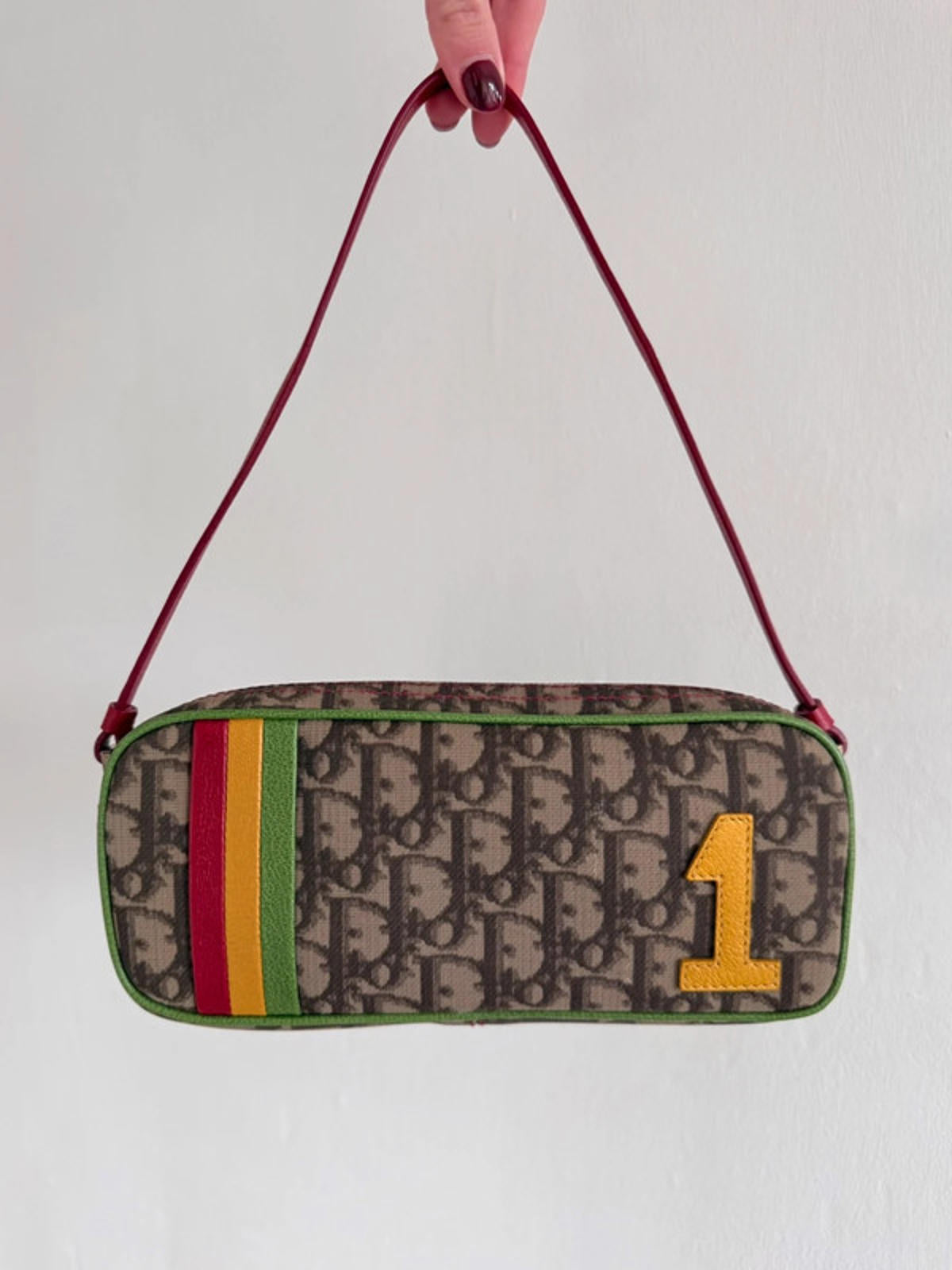 Authentic vintage Christian Dior shoulder bag from the iconic Rasta line featuring the classic Dior Trotter monogram canvas with vibrant green/yellow/red stripes and red leather trim. This compact rectangular silhouette has a slim red leather shoulder strap, silver-tone hardware, and a secure top zip closure. Inside is a red textile lining with Christian Dior Paris label and Made in Italy stamp (code 25-MA-0044). Perfect everyday bag for uni, days out, summer, festival or travel — fits phone, wallet and essentials with effortless Y2K Dior vibes.