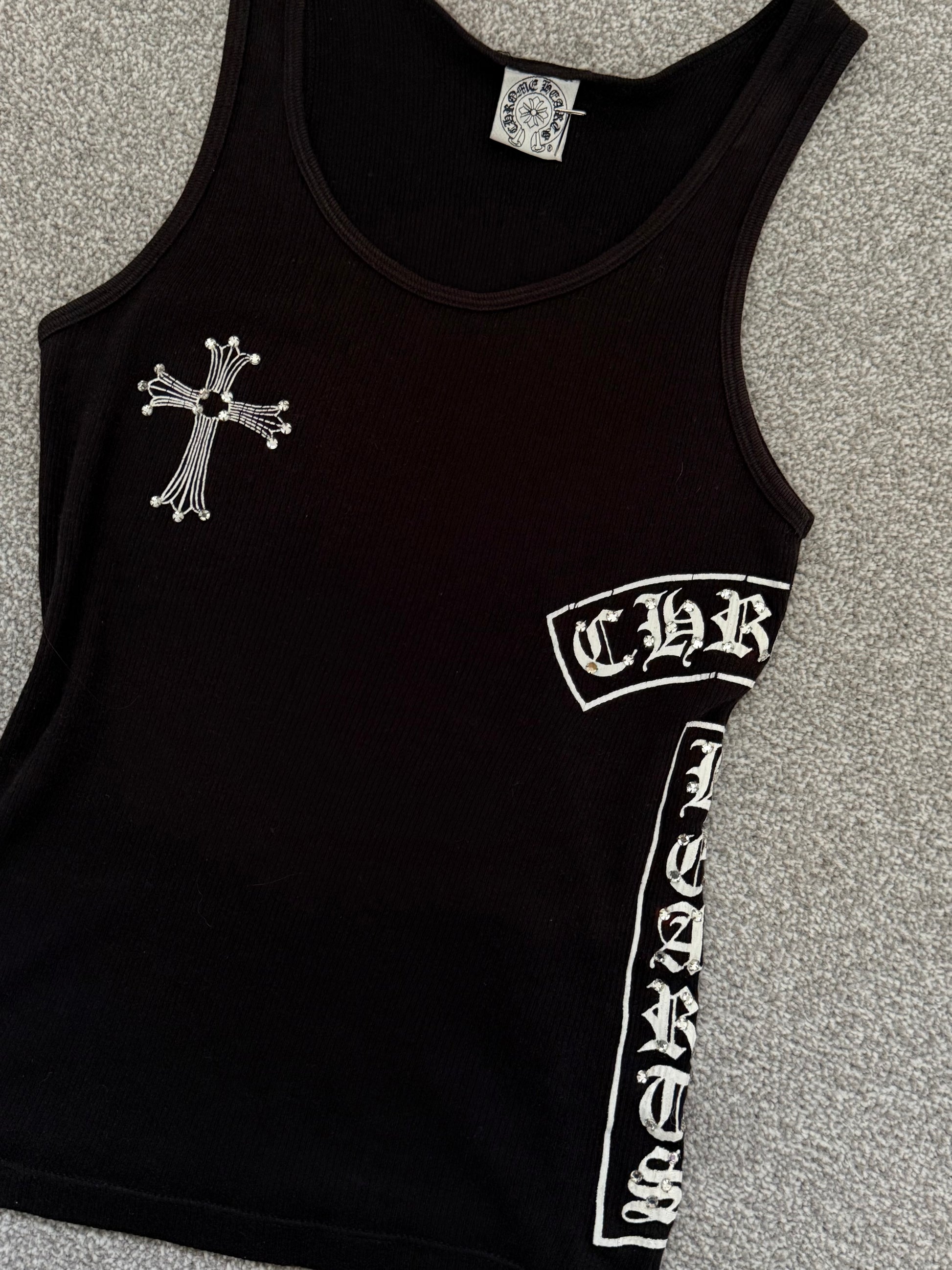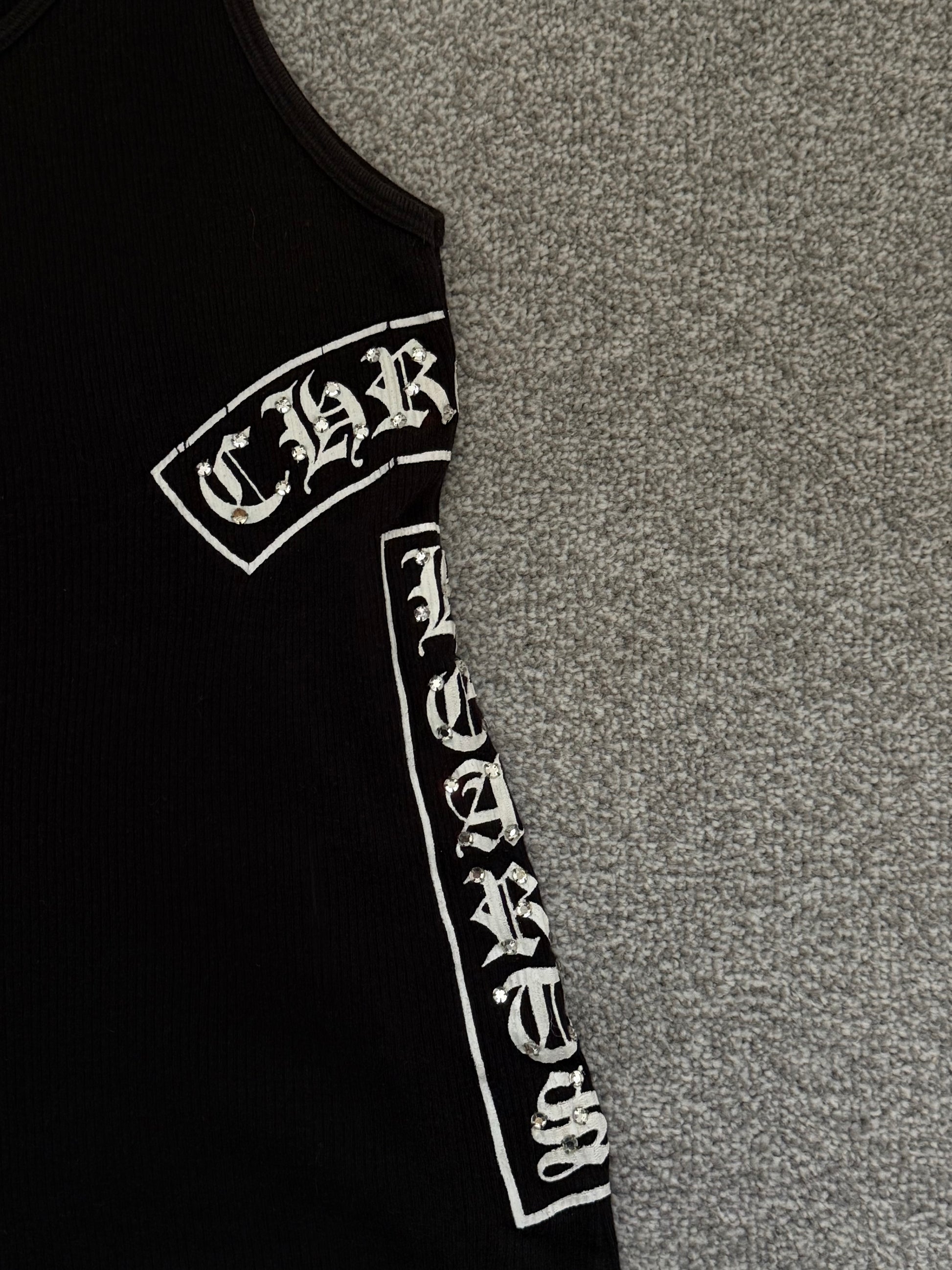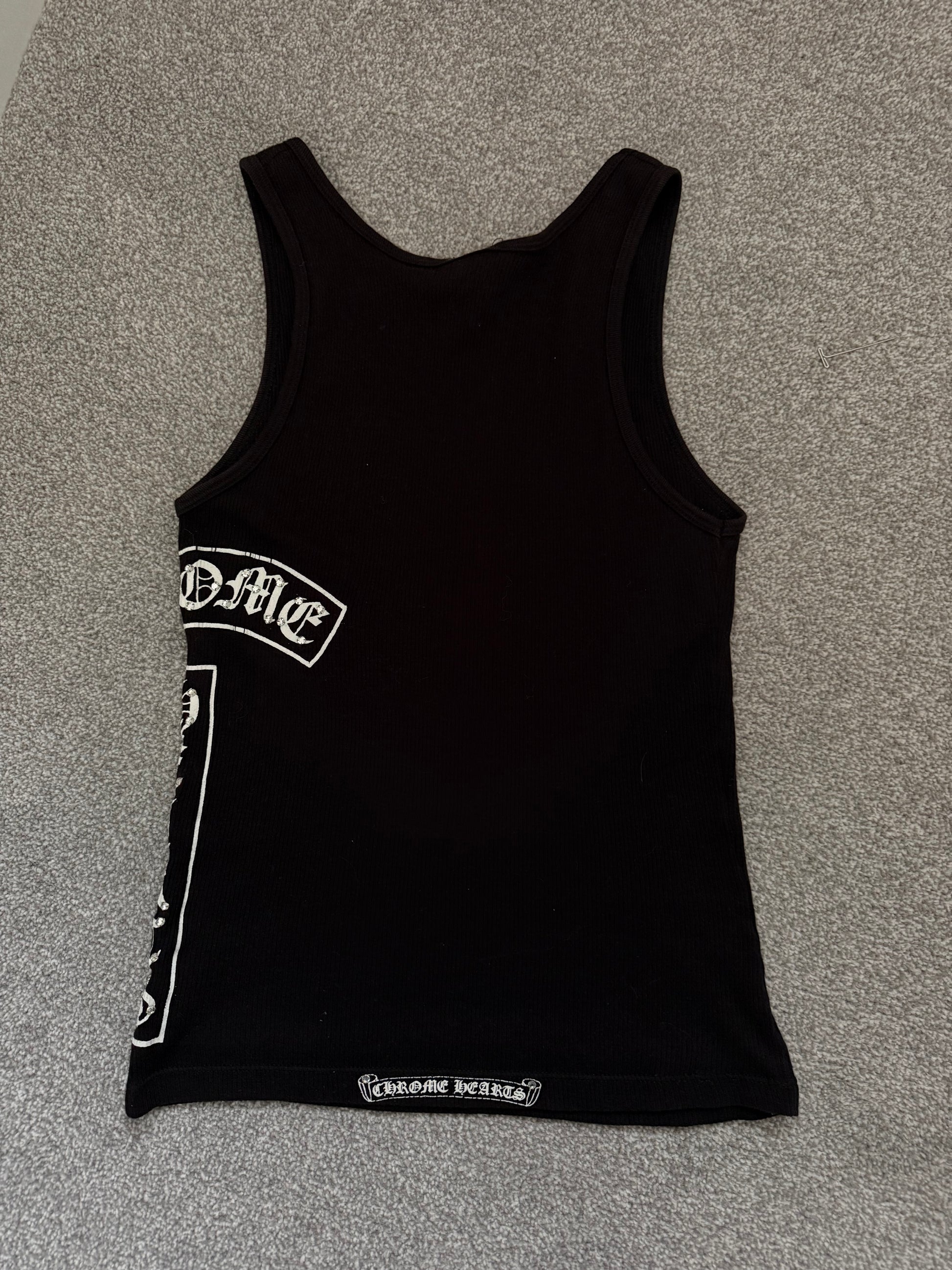 Authentic Chrome Hearts ribbed tank top in black with white gothic logo detailing and signature cross motif at the chest. Features vertical “Chrome Hearts” branding down the side in classic Old English font.
