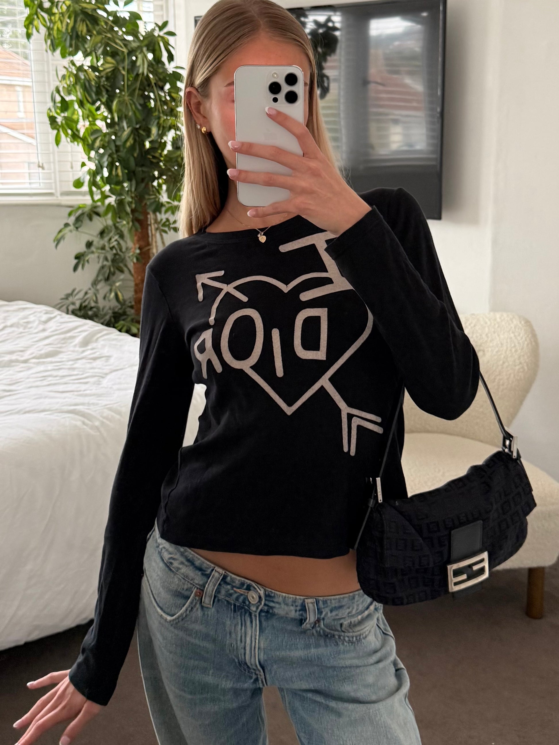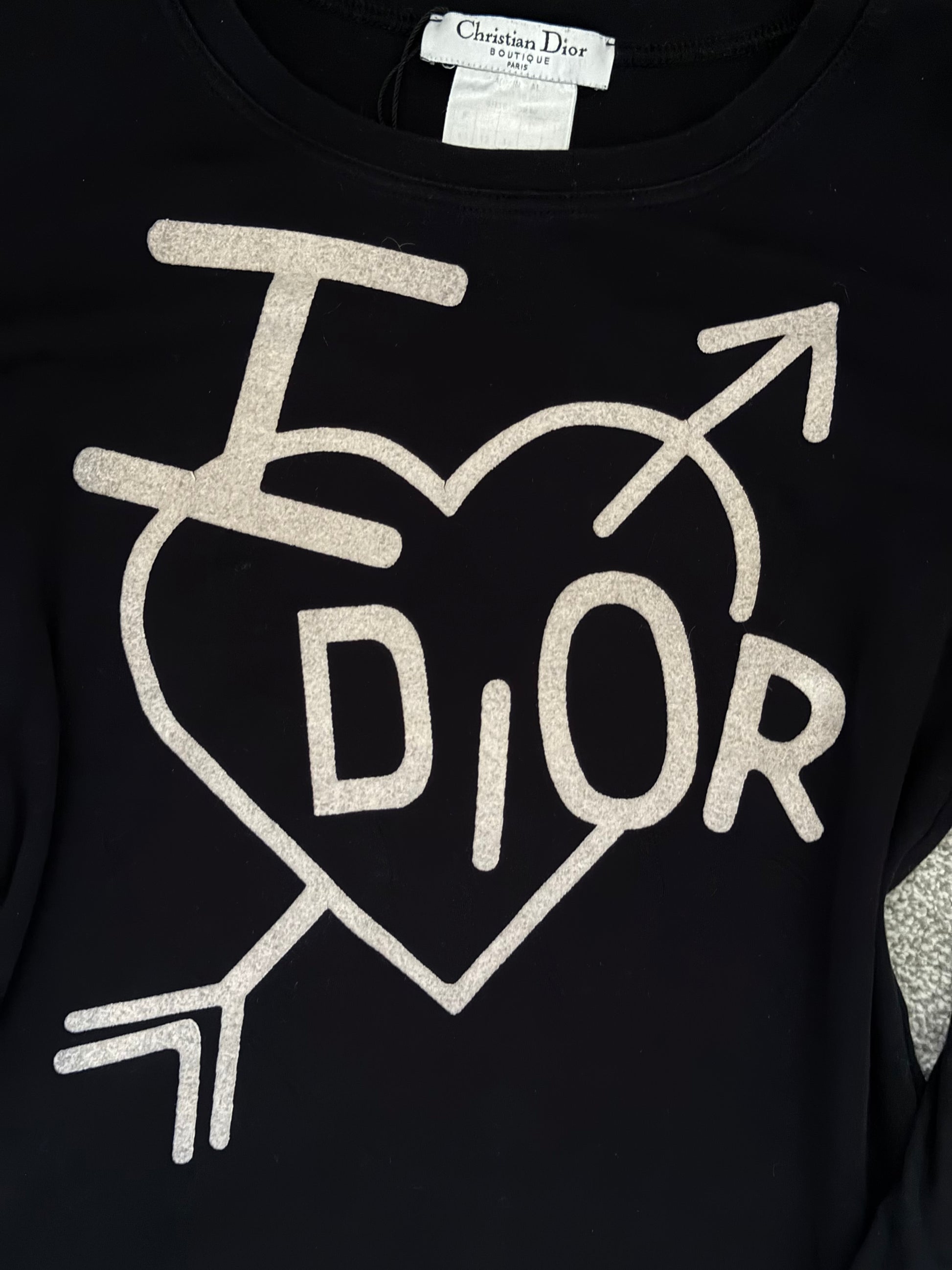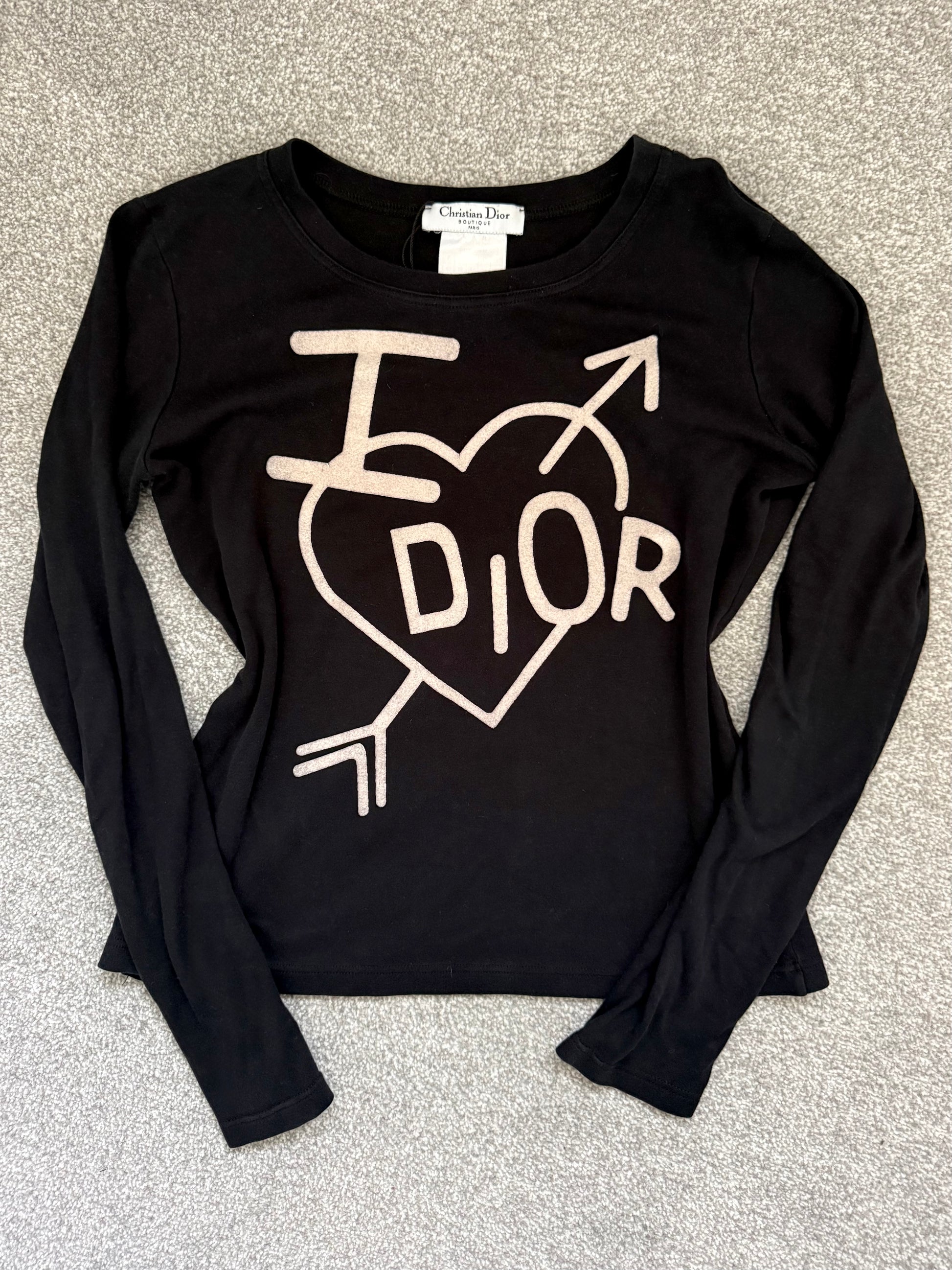 Rare vintage Christian Dior “I <3 Dior” long sleeve top from the iconic John Galliano era, circa early 2000s. Features the bold heart and arrow graphic with “DIOR” lettering across the front — one of the most recognisable Y2K Dior designs.