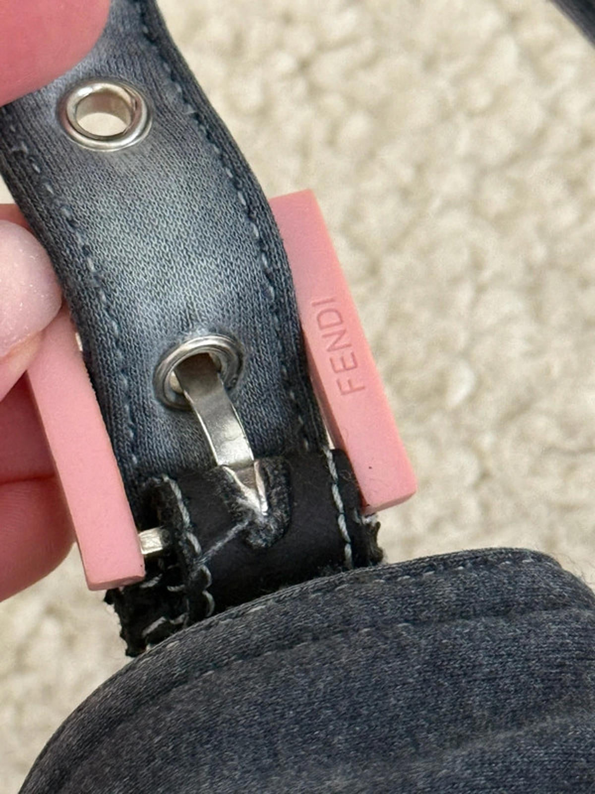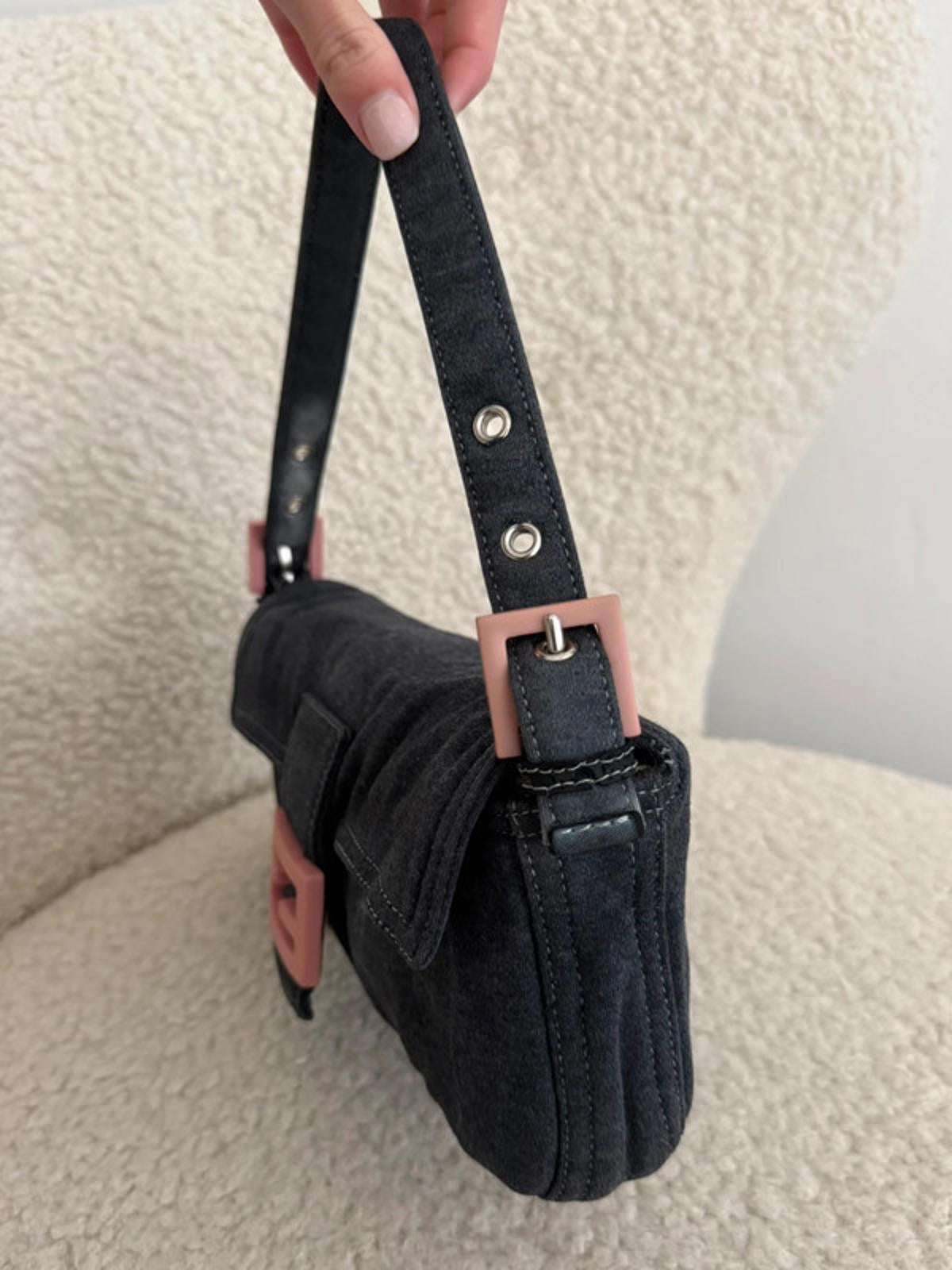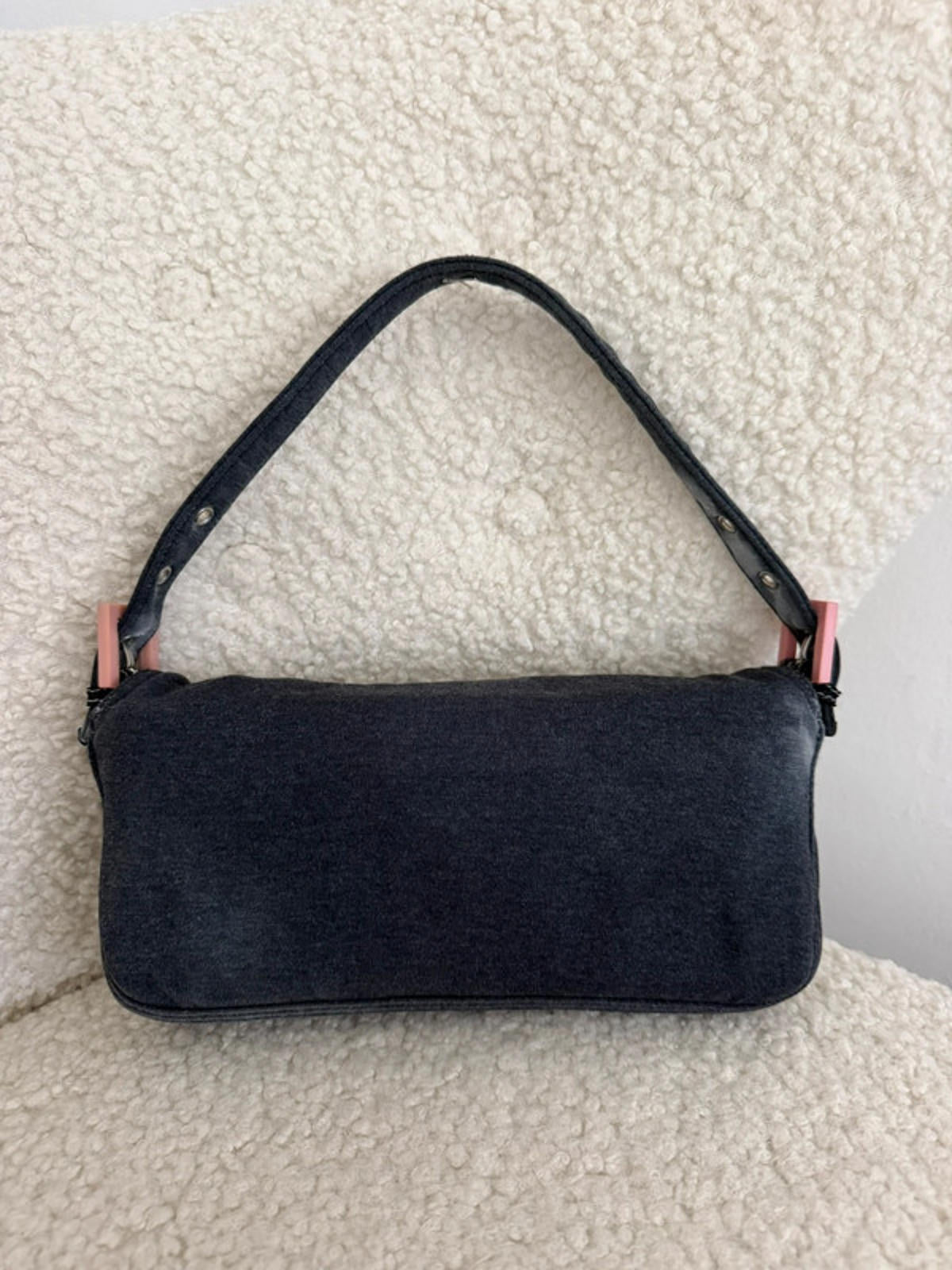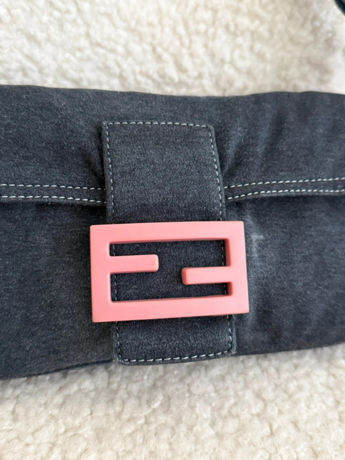 Fendi Baguette shoulder bag featuring the iconic FF logo hardware in pink. The exterior is made from a textile fabric that has been re dyed