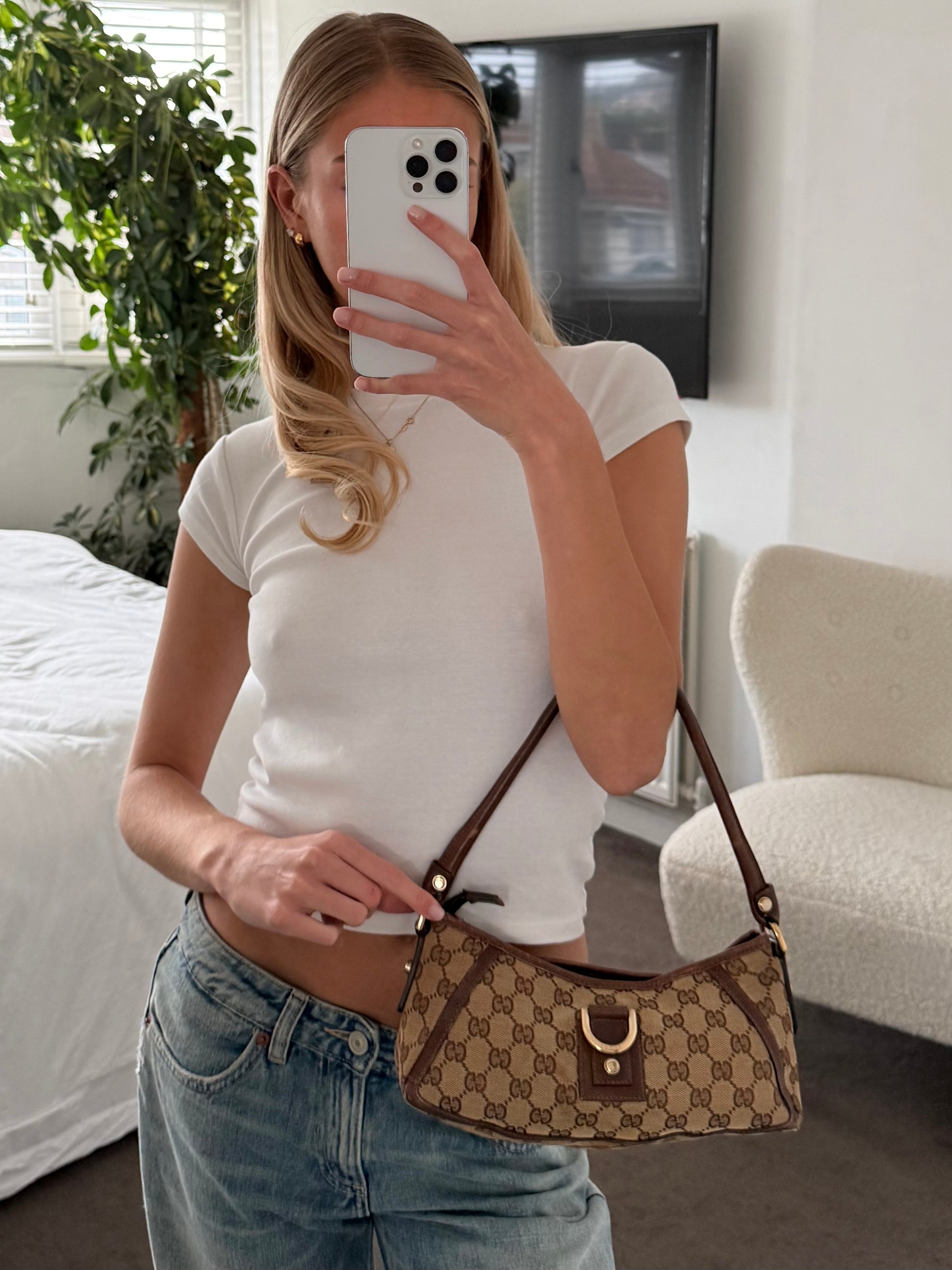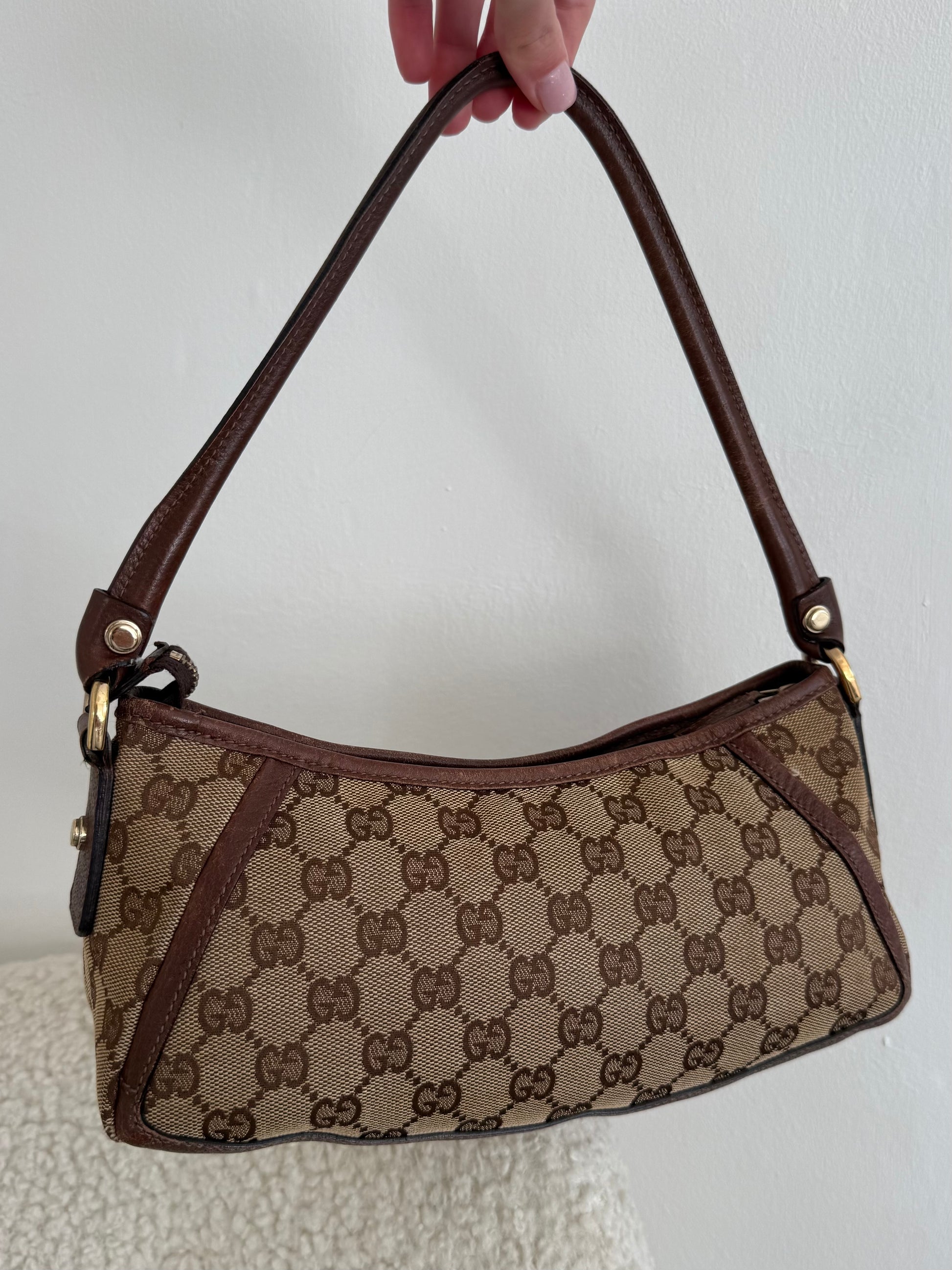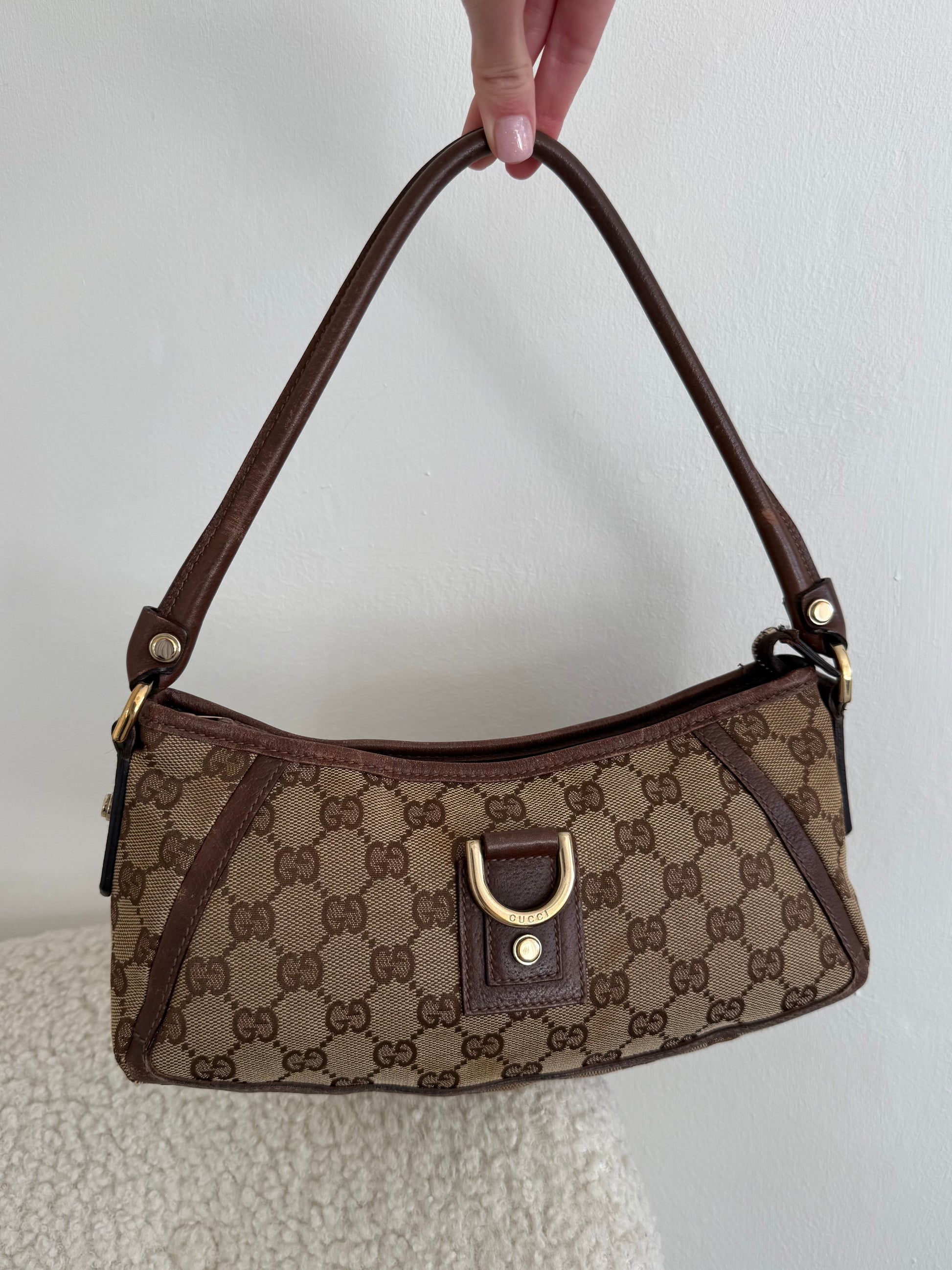 gucci abbey d ring, vintage gucci bag, y2k gucci, gg monogram, brown shoulder bag, 2000s designer, archive gucci, baguette style, mini shoulder bag