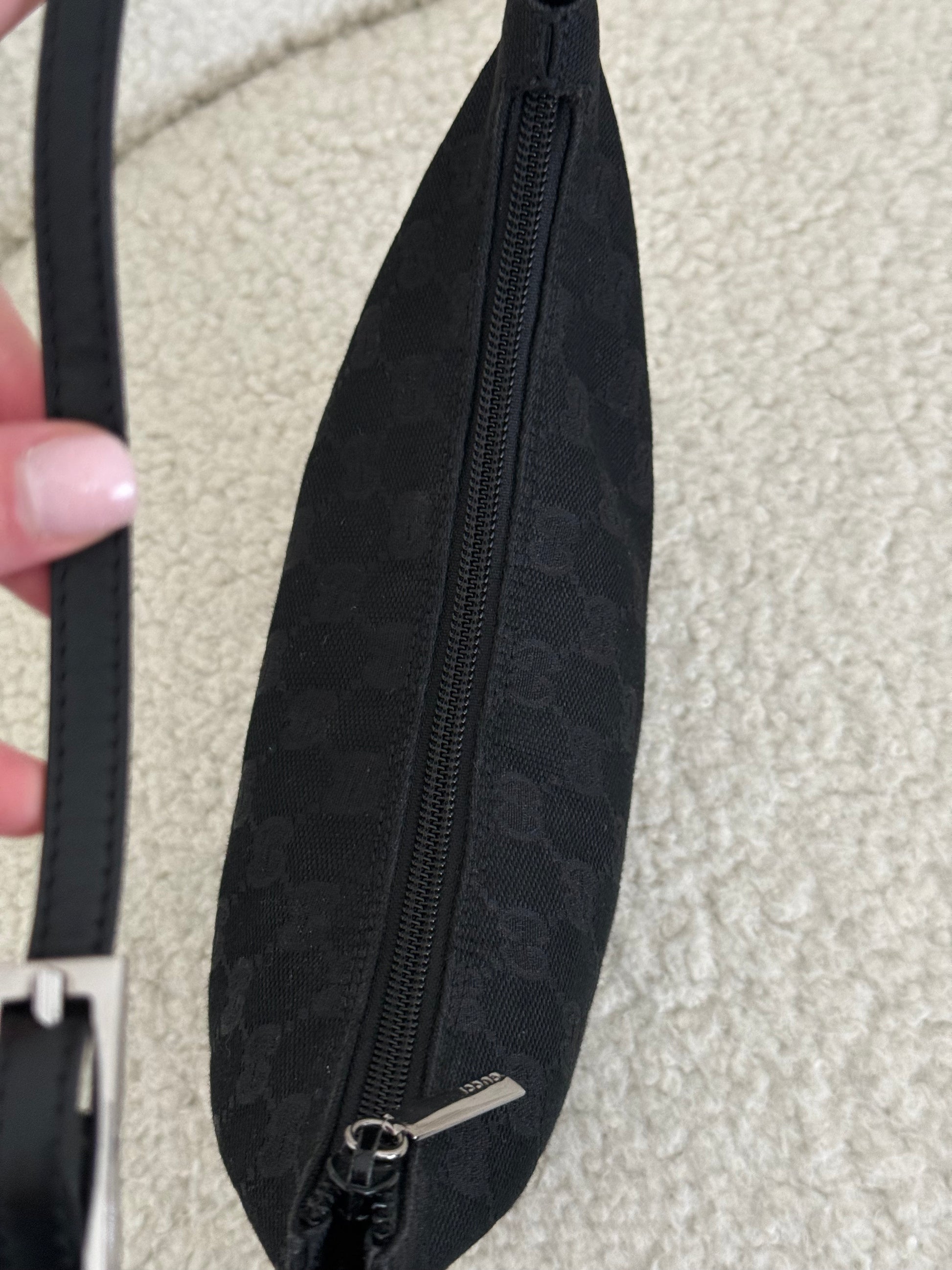 Designed in a compact, softly curved silhouette with a slim black leather shoulder strap. The bag features a zip-top closure and clean, minimal lines, finished with silver-tone hardware and an engraved Gucci zip pull.