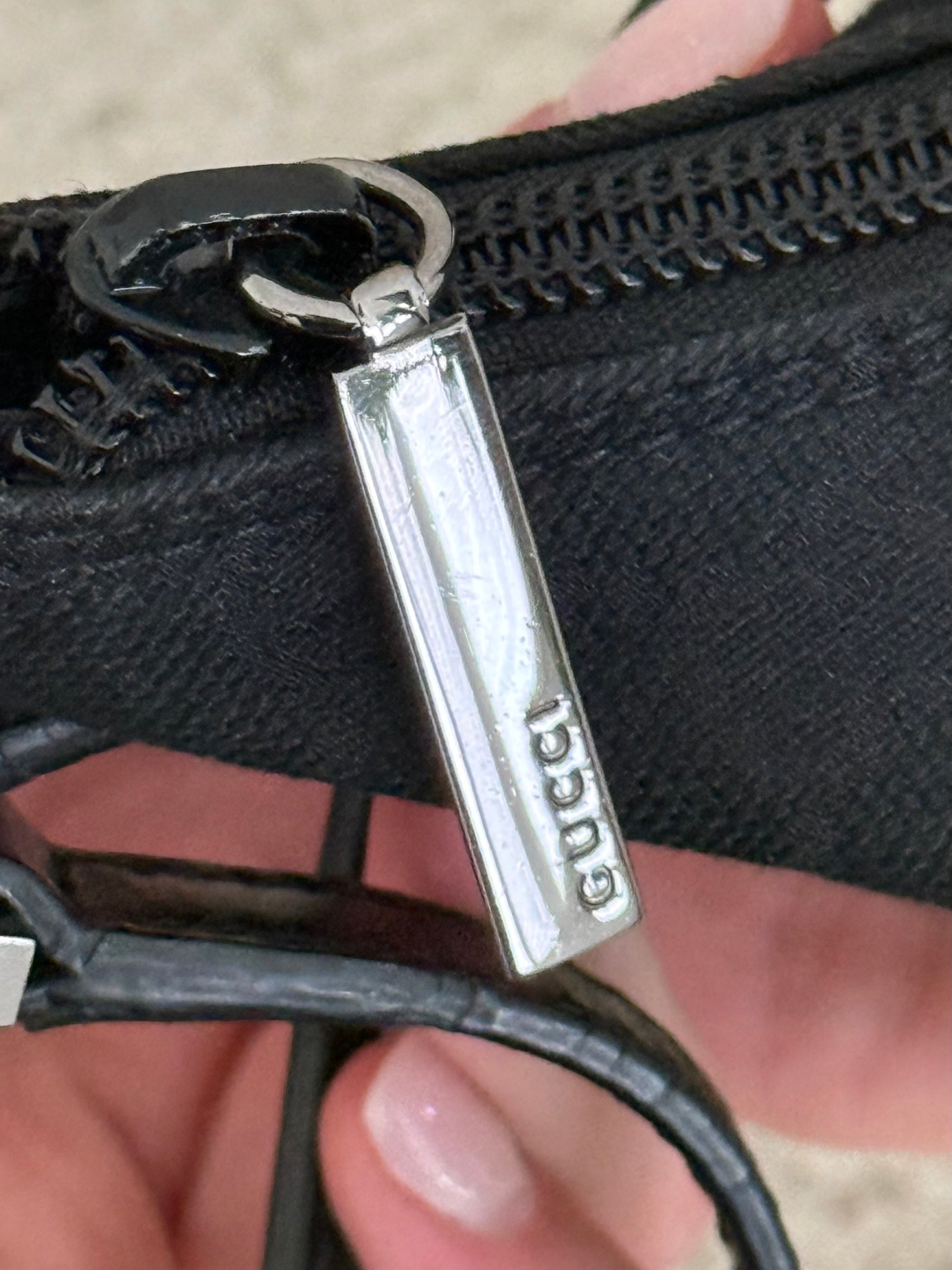 - Silver-tone hardware with engraved Gucci detailing