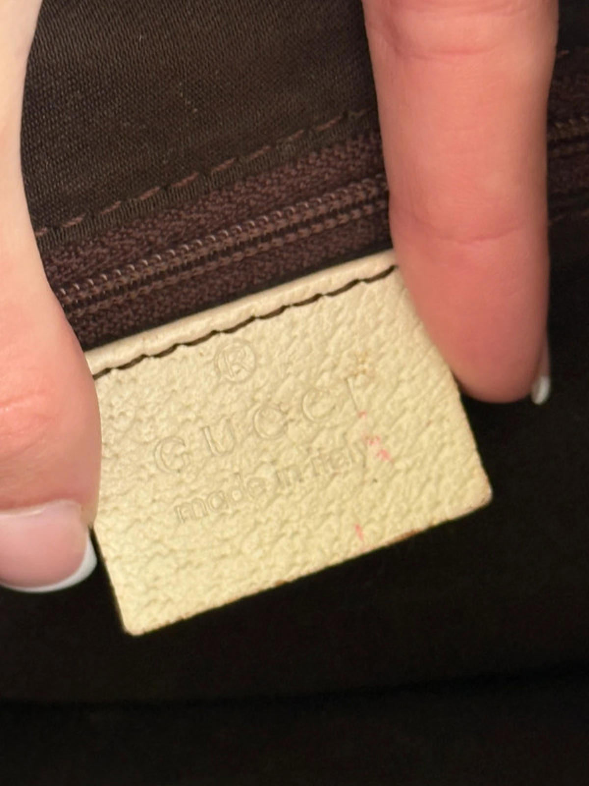 Authentic Gucci shoulder bag featuring beige/brown GG monogram canvas body and light beige (ecru) leather trim. Front D‑ring and hardware are gold-tone metal. Top zip closure leads into a fabric-lined interior with a zip and/or slip pocket for essentials.