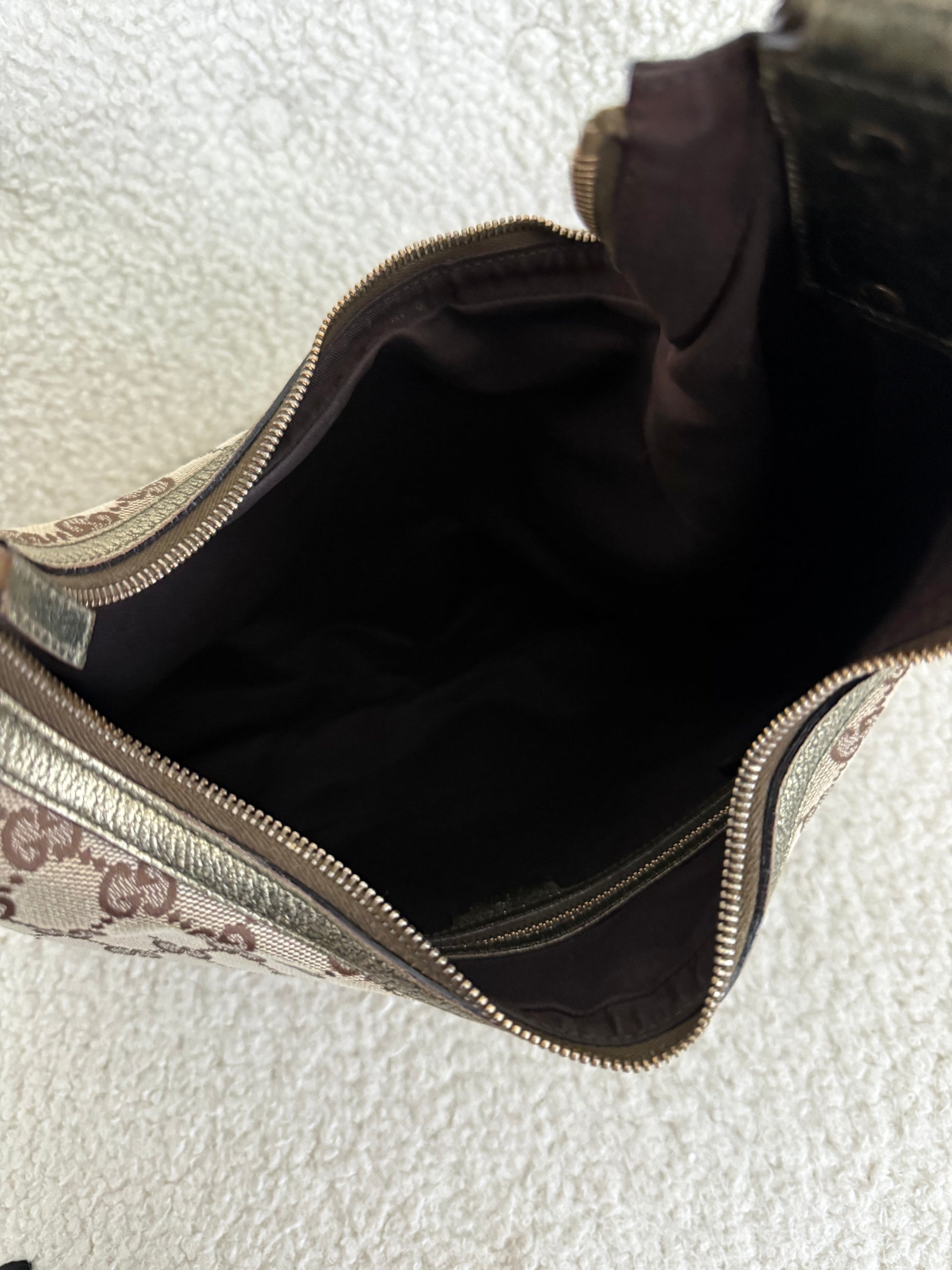 Features a softly structured silhouette with a curved shoulder strap designed to sit neatly under the arm — a very recognisable Y2K Gucci shape. Finished with metallic leather trim, zip-top closure, and a roomy interior lined in brown fabric, ideal for everyday essentials.