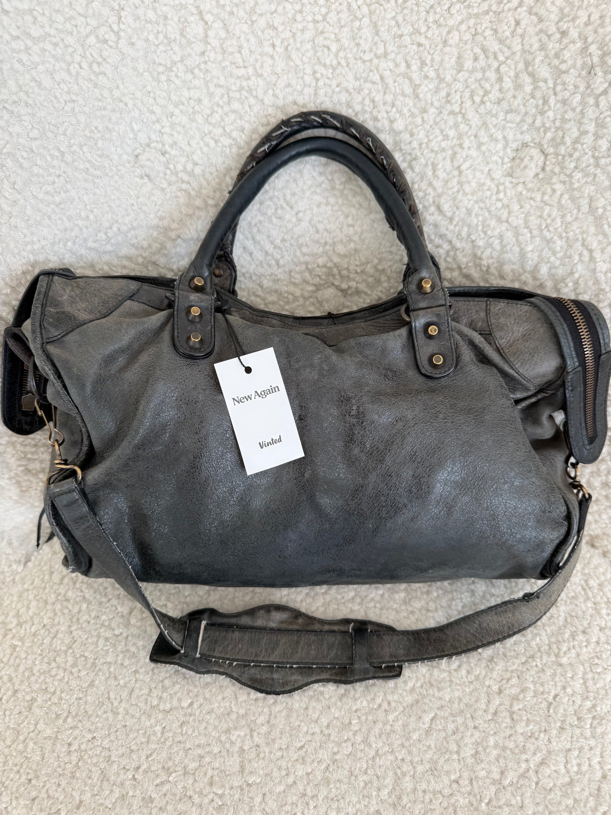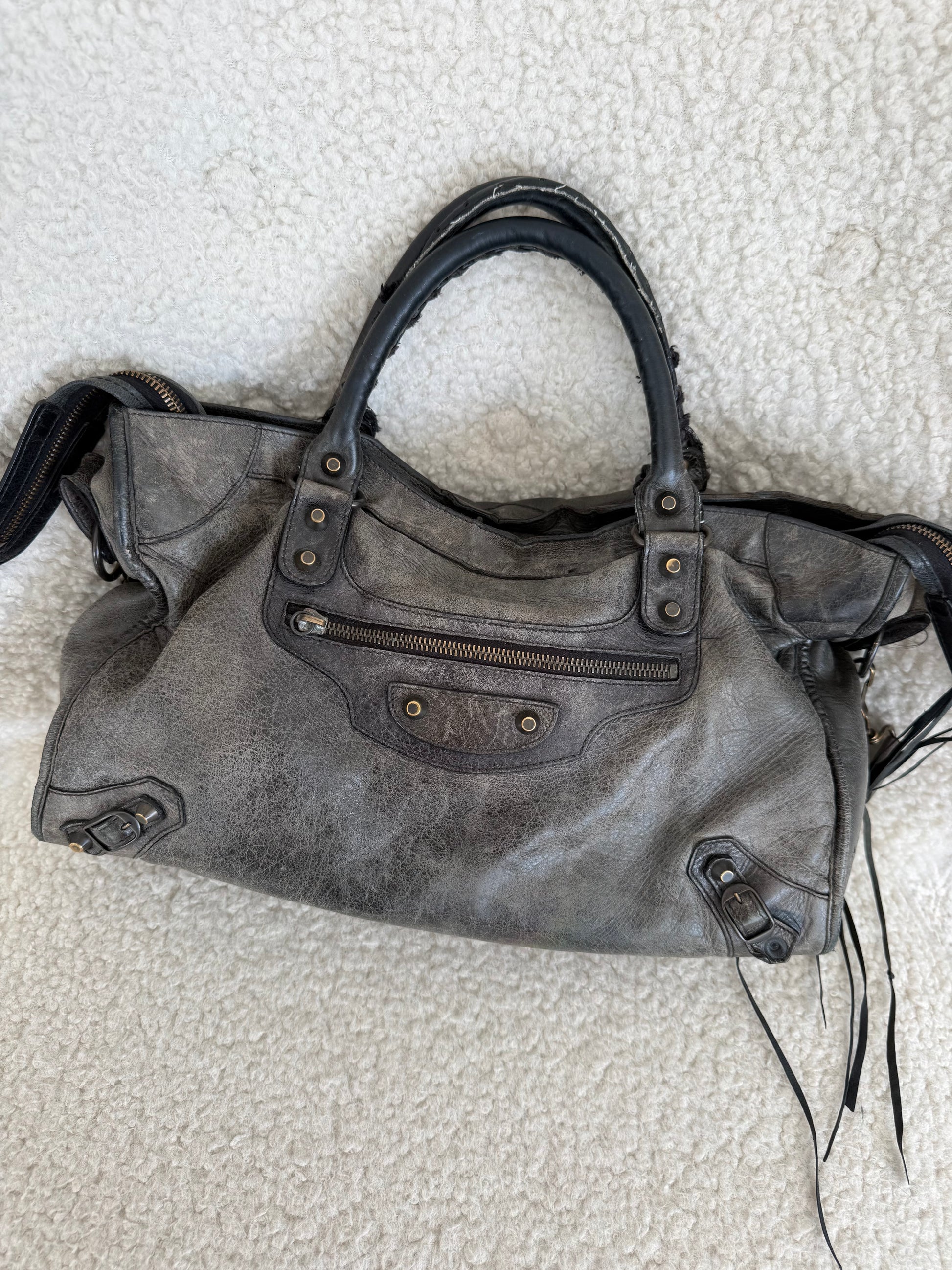 Iconic Balenciaga City in beautifully worn grey distressed leather with classic aged brass hardware. Features the signature front zip pocket, stud detailing, tassel zip pulls, whipstitched top handles and detachable shoulder strap.