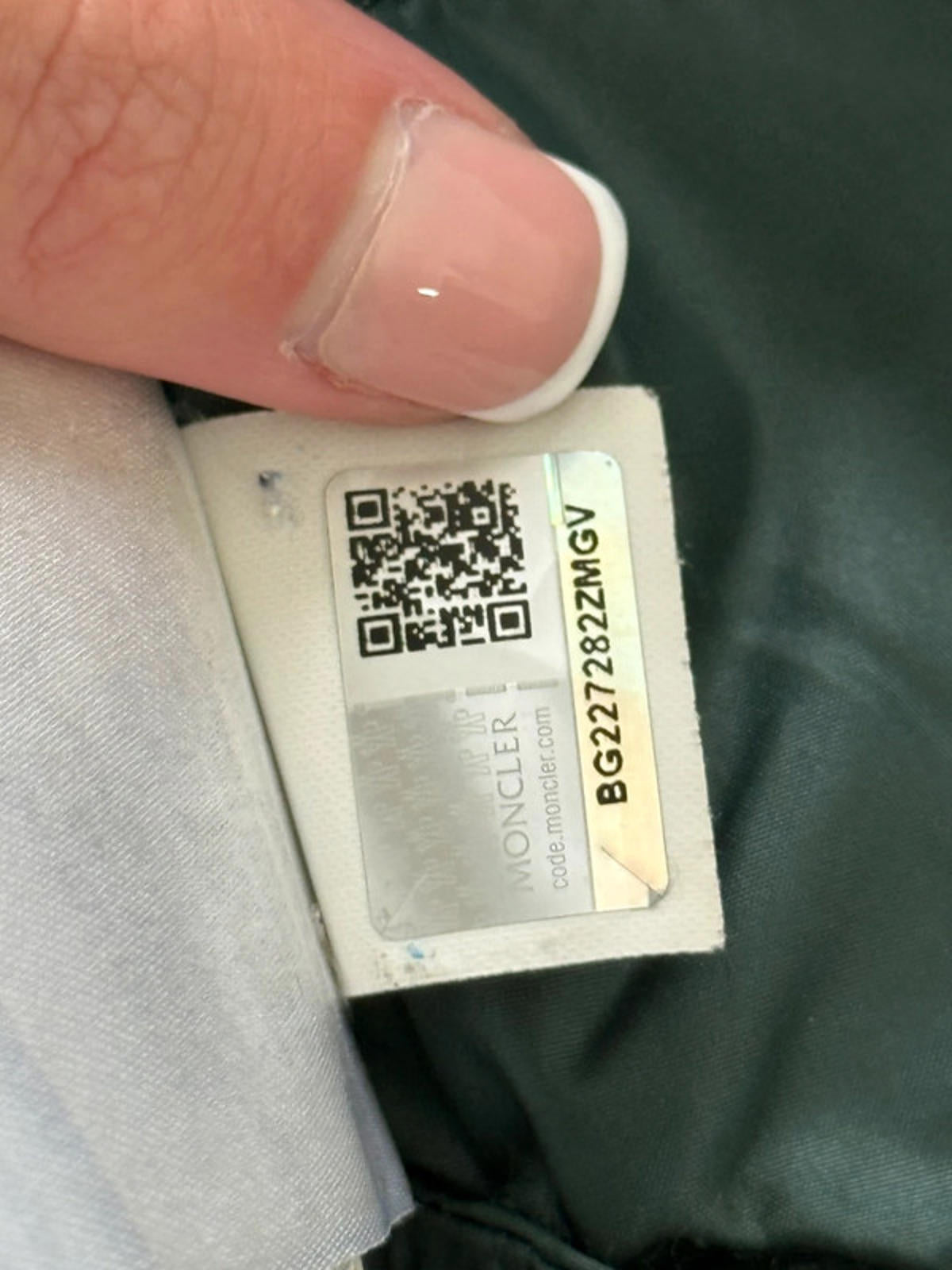 Authentic Moncler puffer featuring a dark charcoal wool-blend top half and deep forest green nylon lower panels. Premium down-filled insulation, detachable hood, zip front, and signature arm logo patch. Classic comic strip care label inside and authenticity QR tag. Warm yet lightweight with a structured fit that keeps its shape.