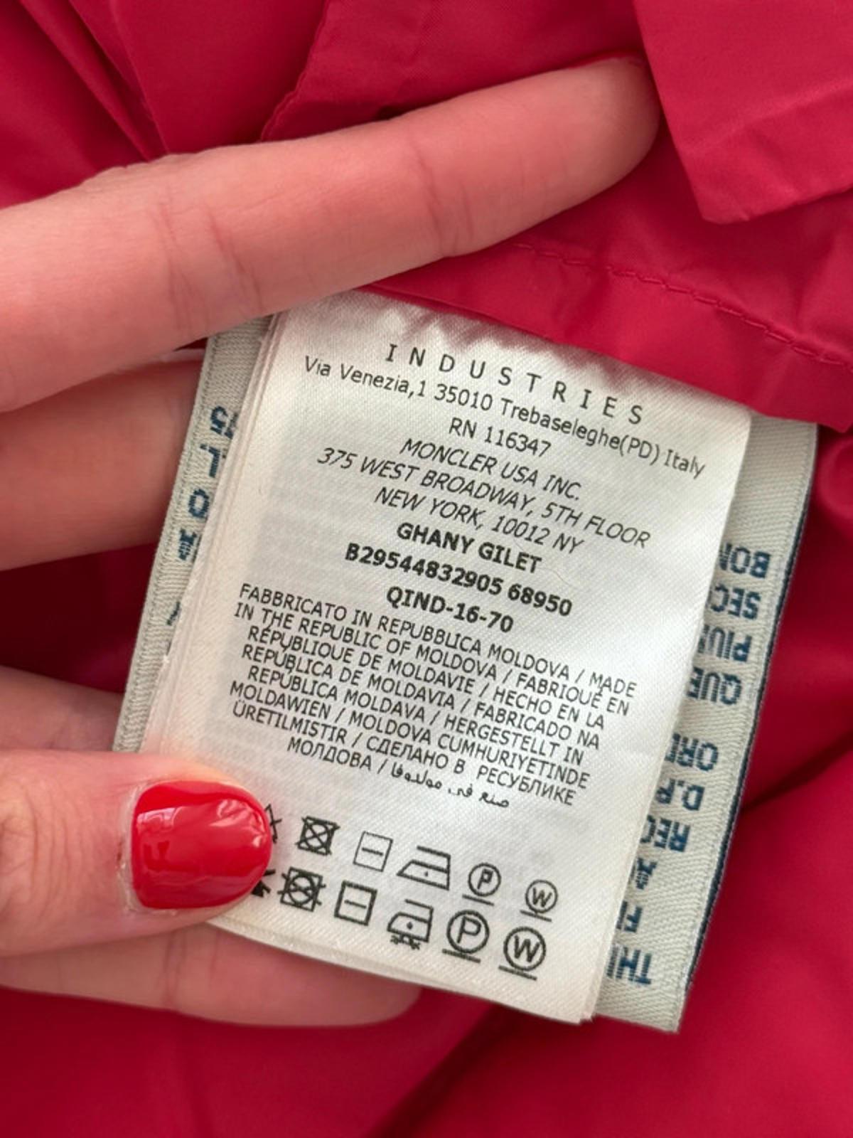 Authentic Moncler Ghany Gilet in a vibrant pink. Classic lightweight down-filled bodywarmer with a high funnel neck, full zip closure, two zipped pockets, and the signature Moncler logo patch on the chest. Made in Moldova with full internal care labels.