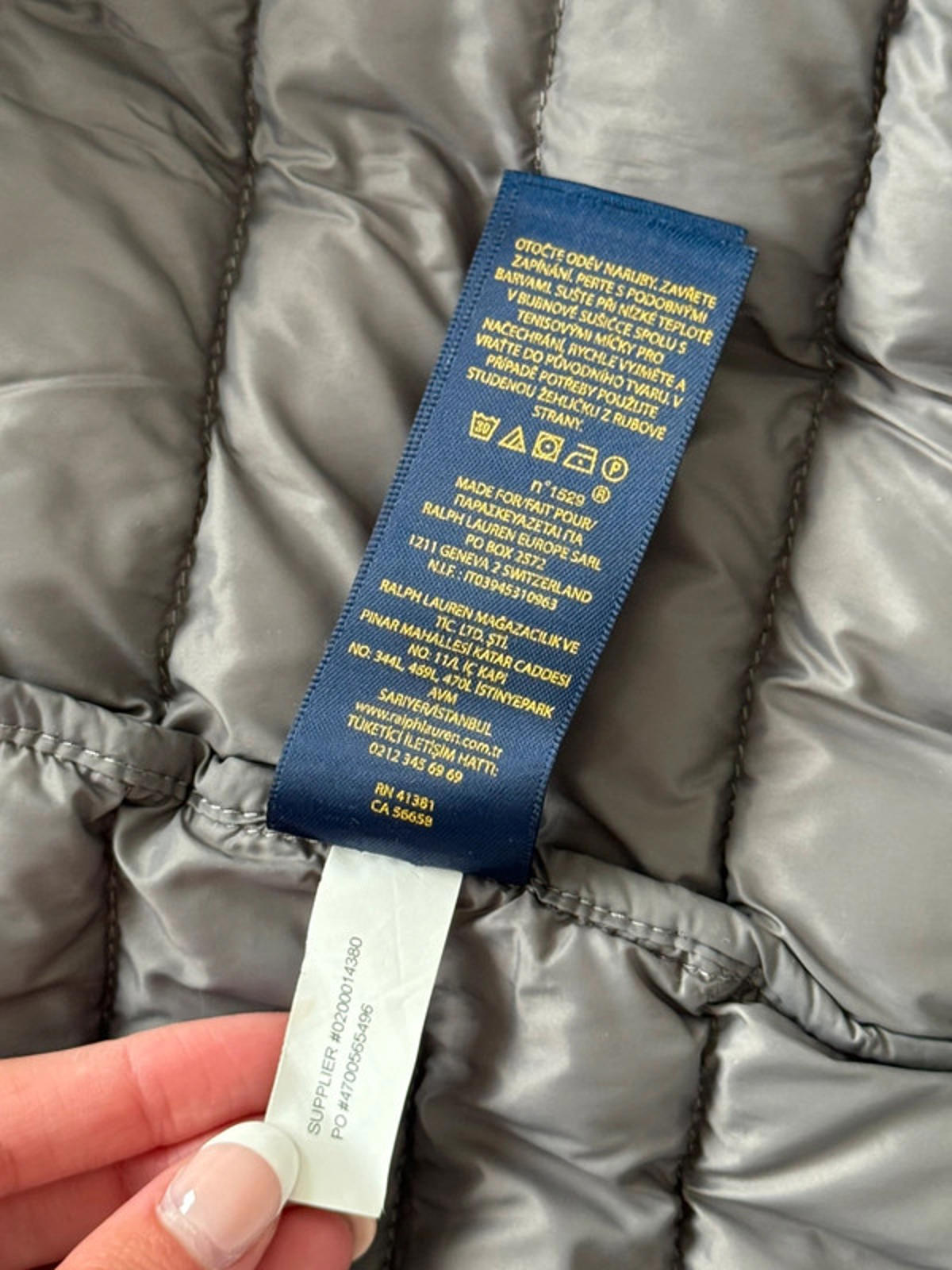 Classic Ralph Lauren Polo lightweight puffer in dark grey with embroidered logo on chest. Designed with a sleek slim fit, full zip closure, and two front zip pockets. Made with a durable polyester shell and filled with soft insulation for warmth without bulk. Timeless and versatile jacket that works perfectly for layering or as a lightweight outerwear option.